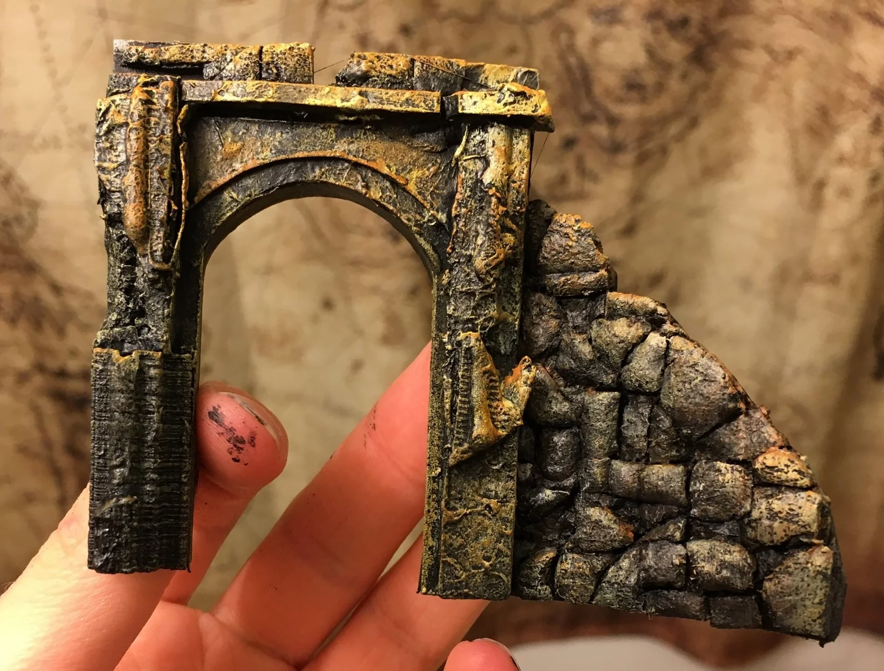 All of the model pieces were hand designed and painted. Construction of the archway structures was aided through using partial 3D printed pieces alongside hand crafted pieces.