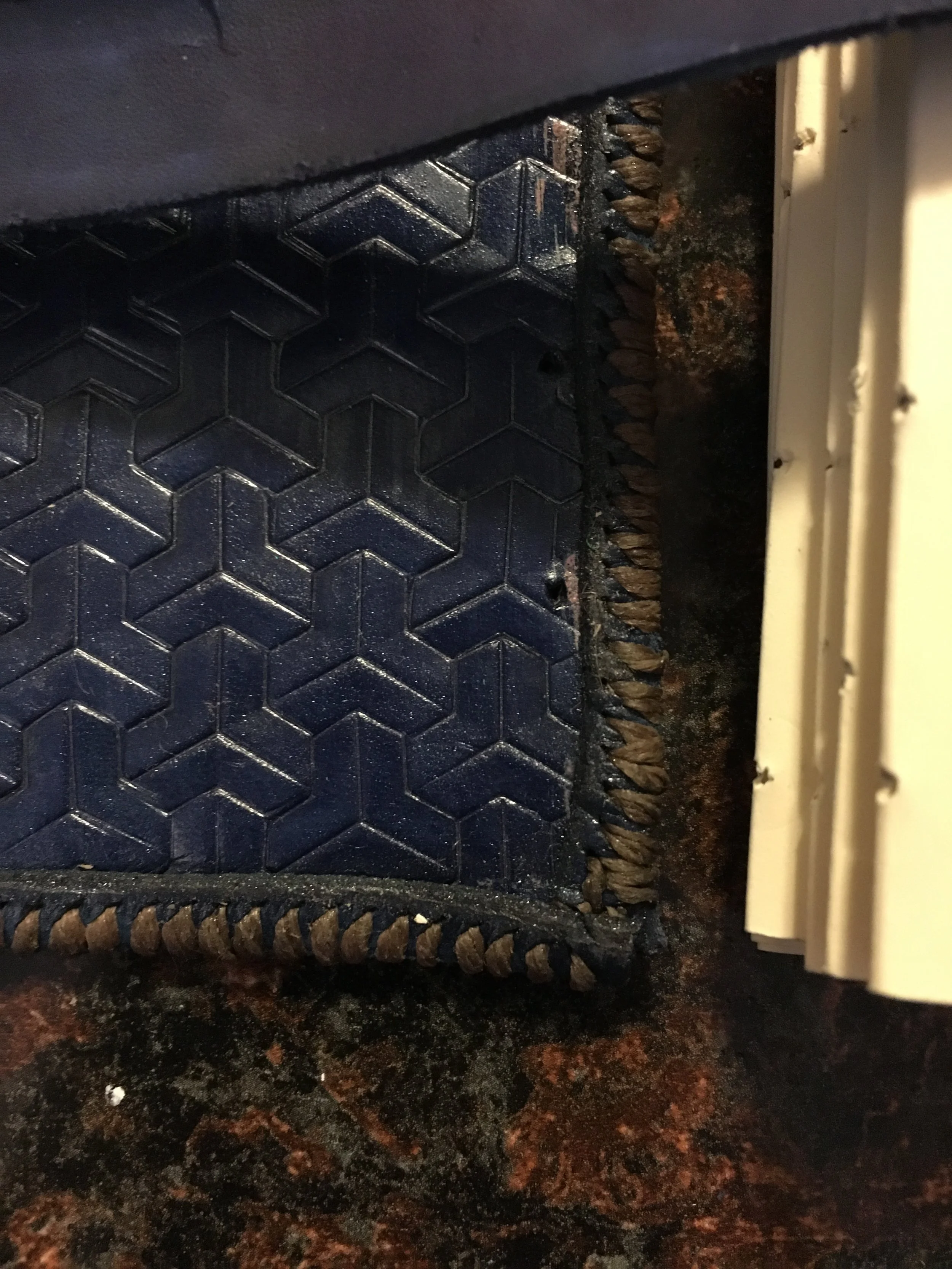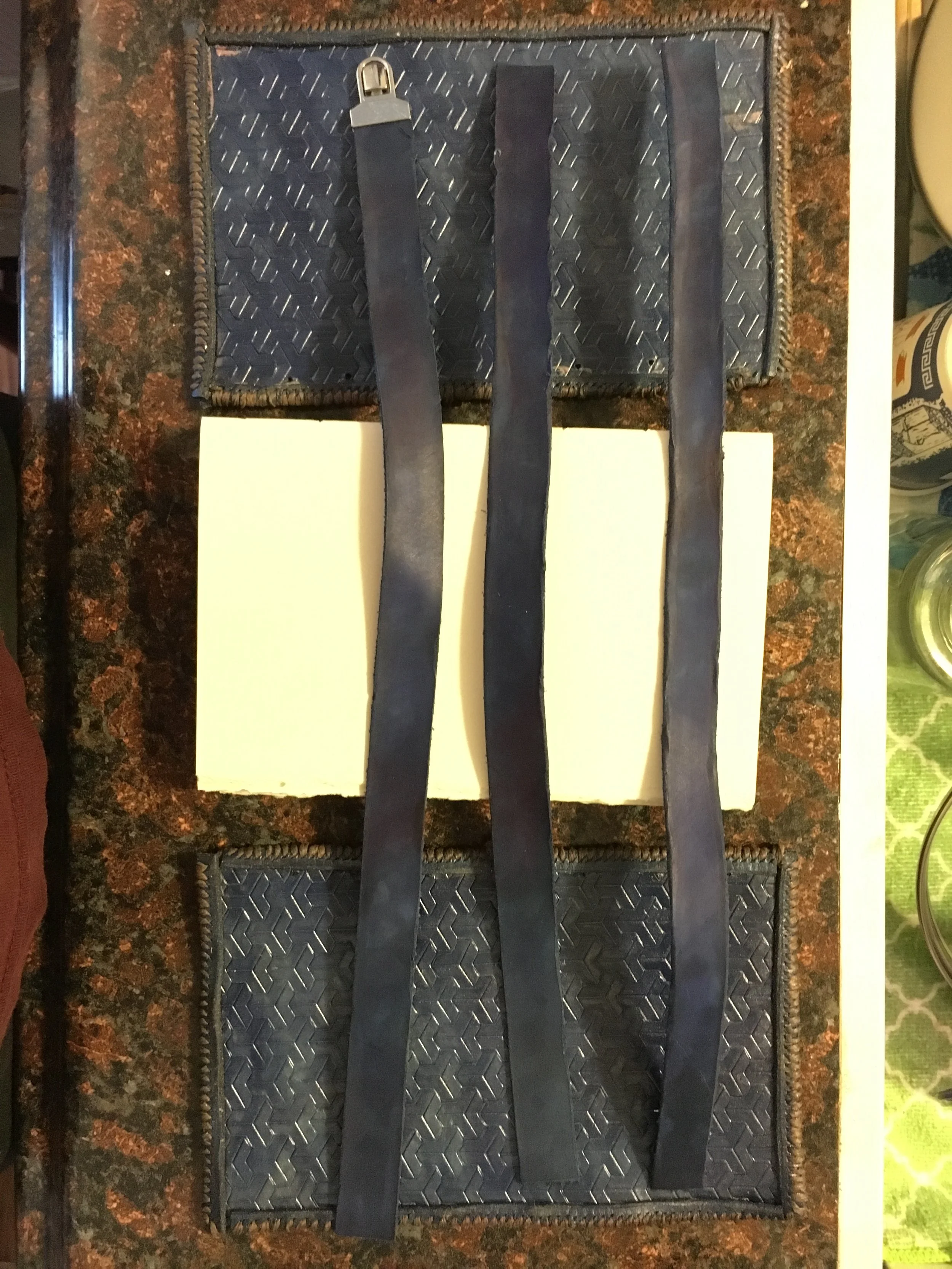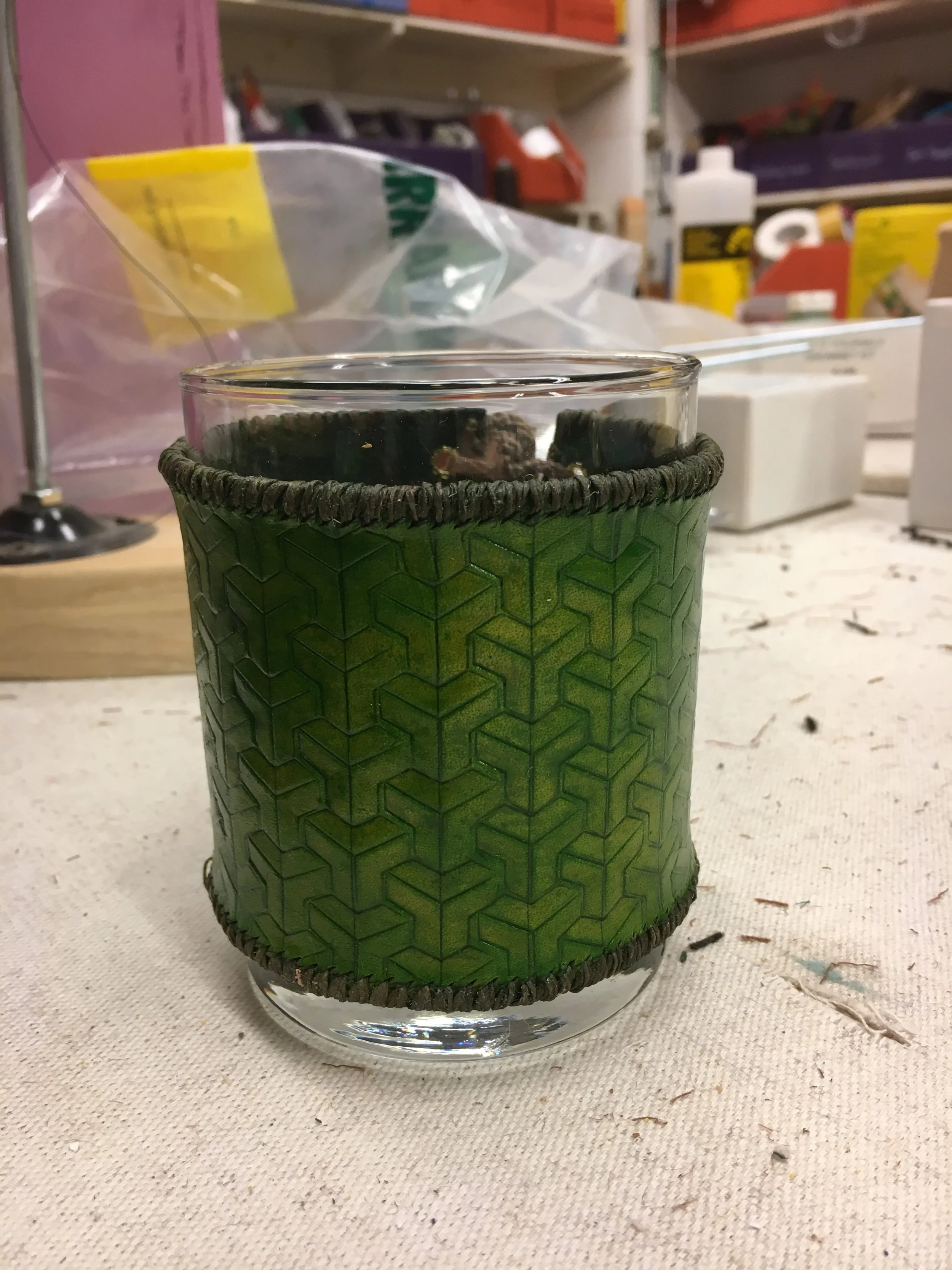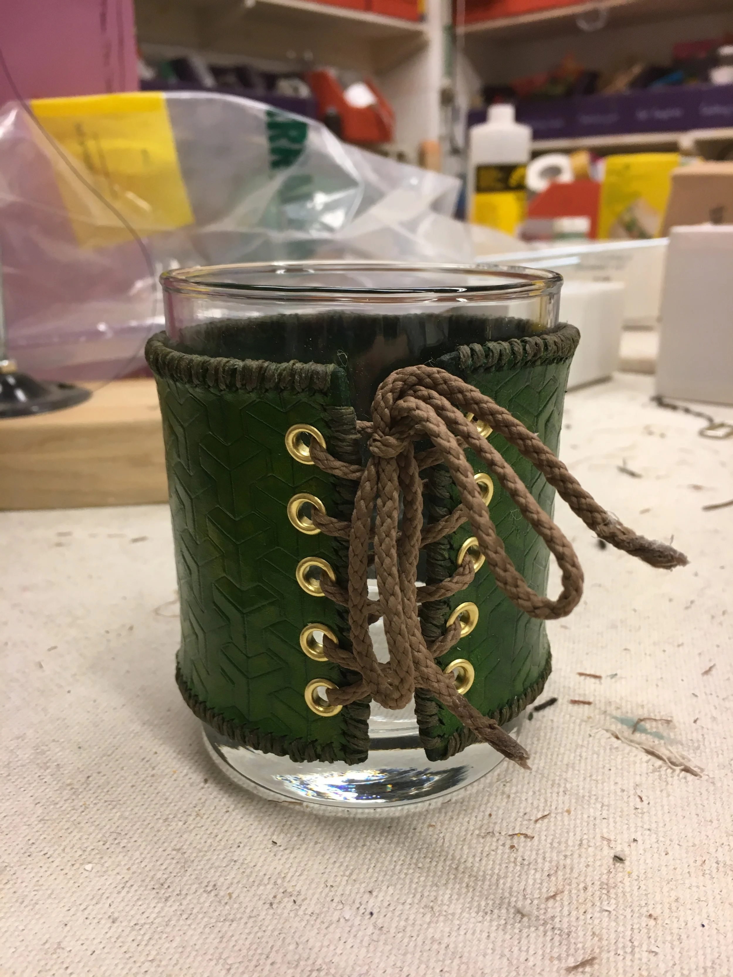 Pieces were cut, hand stamped from a leather stamp tool, and then dyed and sealed. The pieces were then punched to be ready for stitching along the outside edge. Punches were made for grommets so that it could be laced up to add some character.