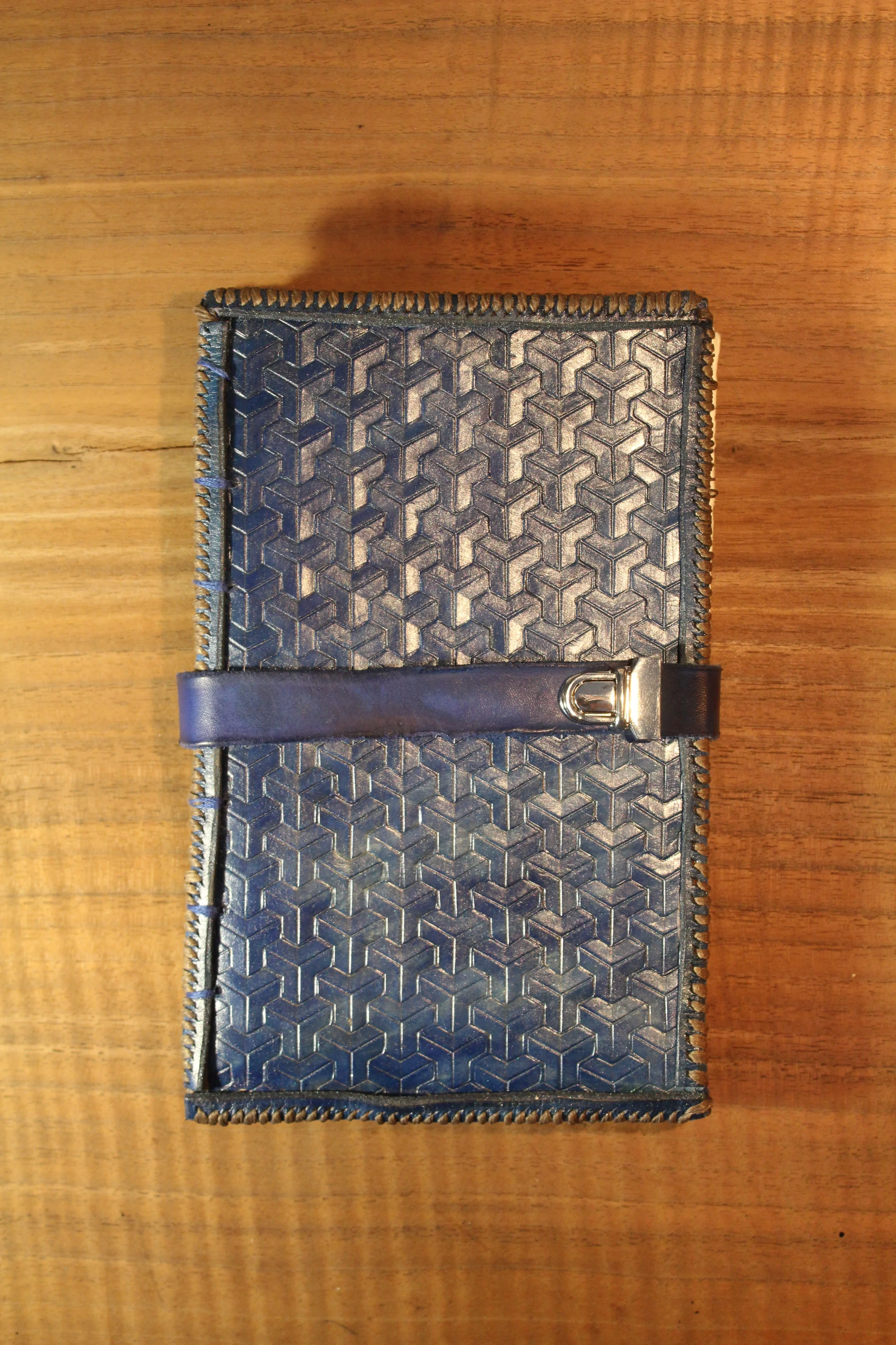 Pieces were cut, hand stamped from a leather stamp tool, and then dyed and sealed. The pieces were then punched to be ready for stitching along the outside edge. Registers were made for the interior and coptic stitched into place.