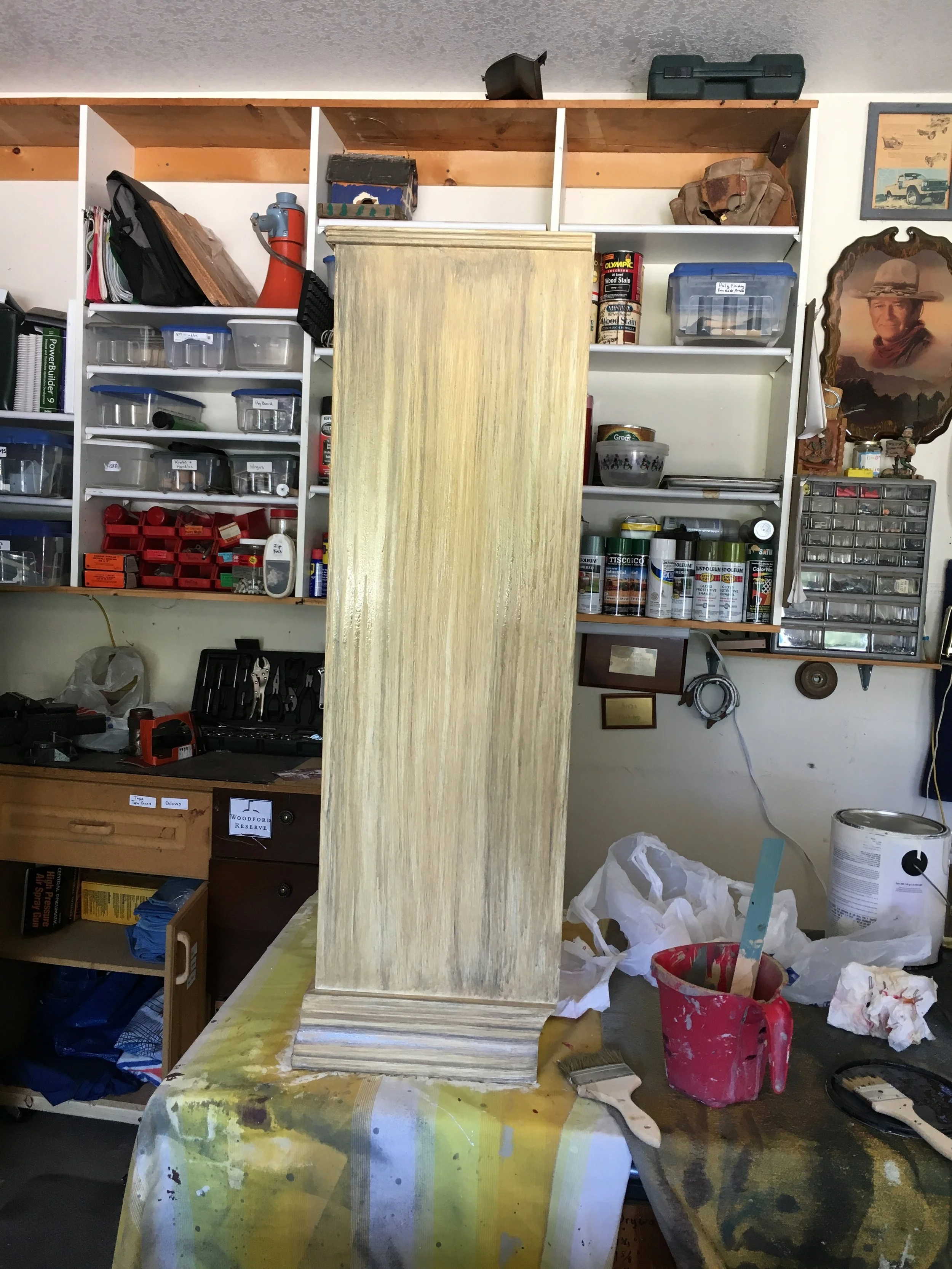 Treatment overlay to an existing white Ikea shoe cabinet that was given a facade of an old library card catalog. The piece was given molding, routed to create fake drawers, handles were applied, and given a paint treatment to resemble wood.