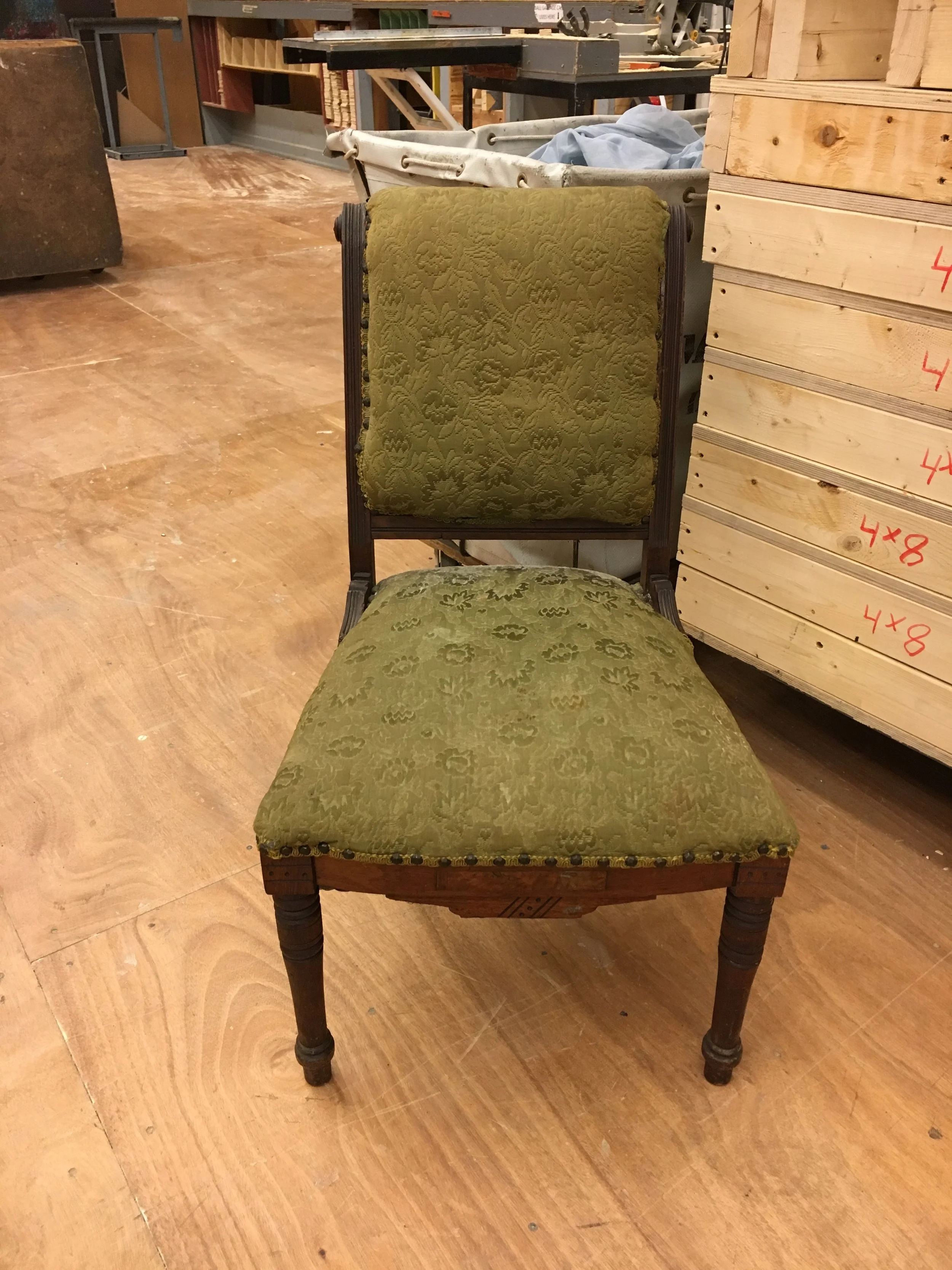 Upon first reciving the chair, inspection and research was done to properly evaluate its age, an appropriate historically influenced fabric choice, and how much damage it may have sustained. The chair was found to be a historical eastlake chair from the Victorian Era, making it about 150 years old. The fabric was moldy, the interior batting was falling apart, the frame was out of square, and the webbing was no longer in place