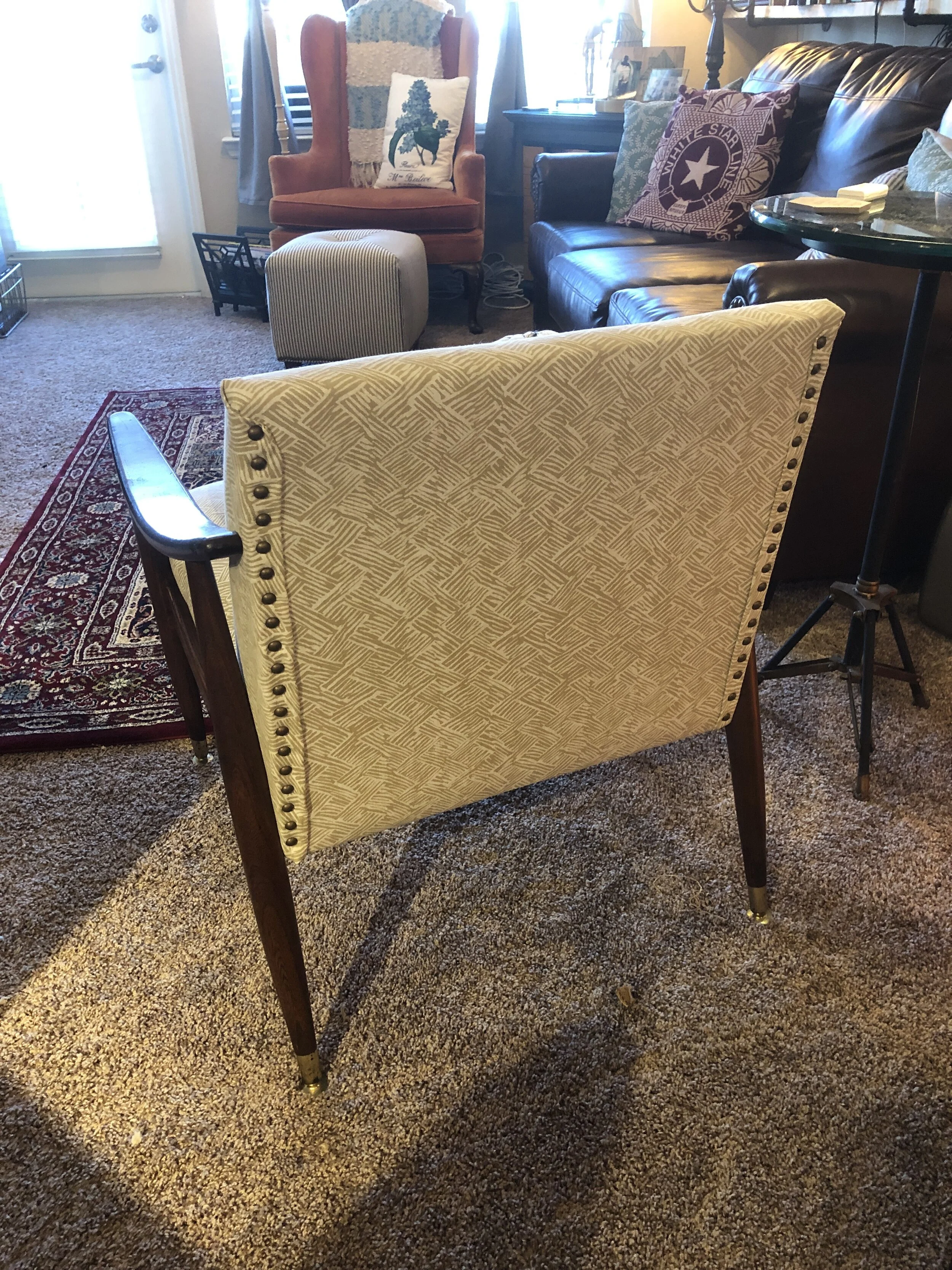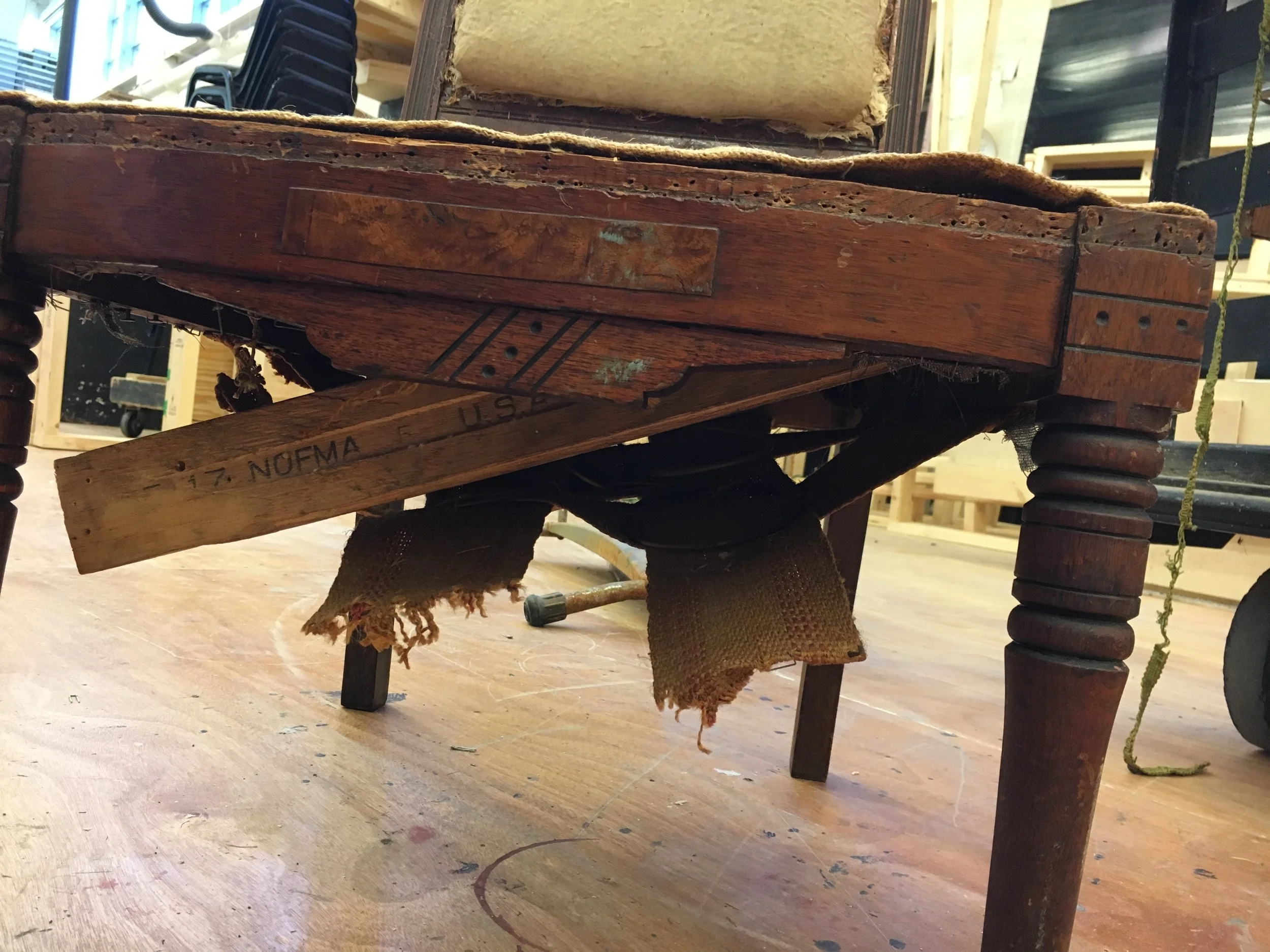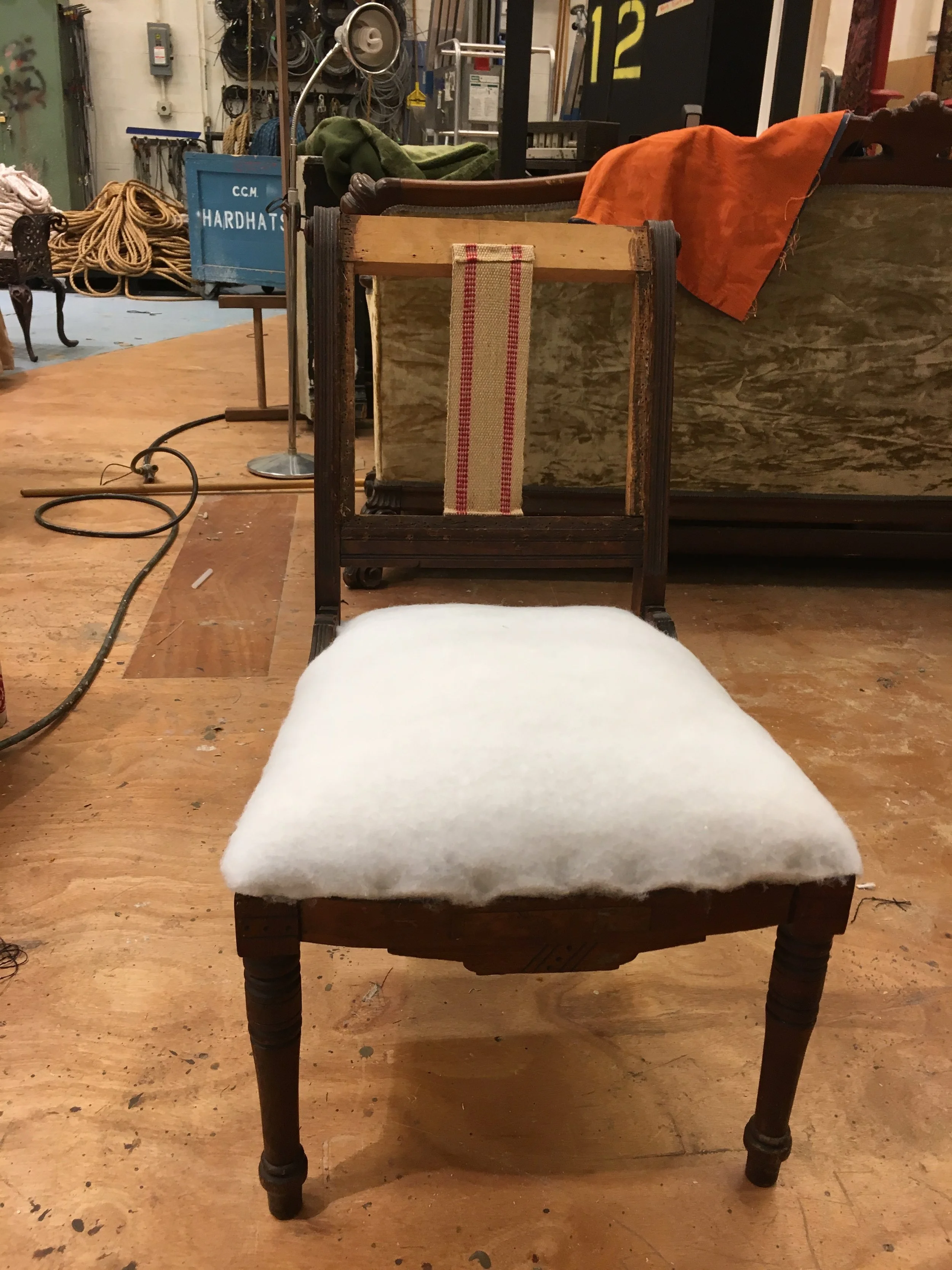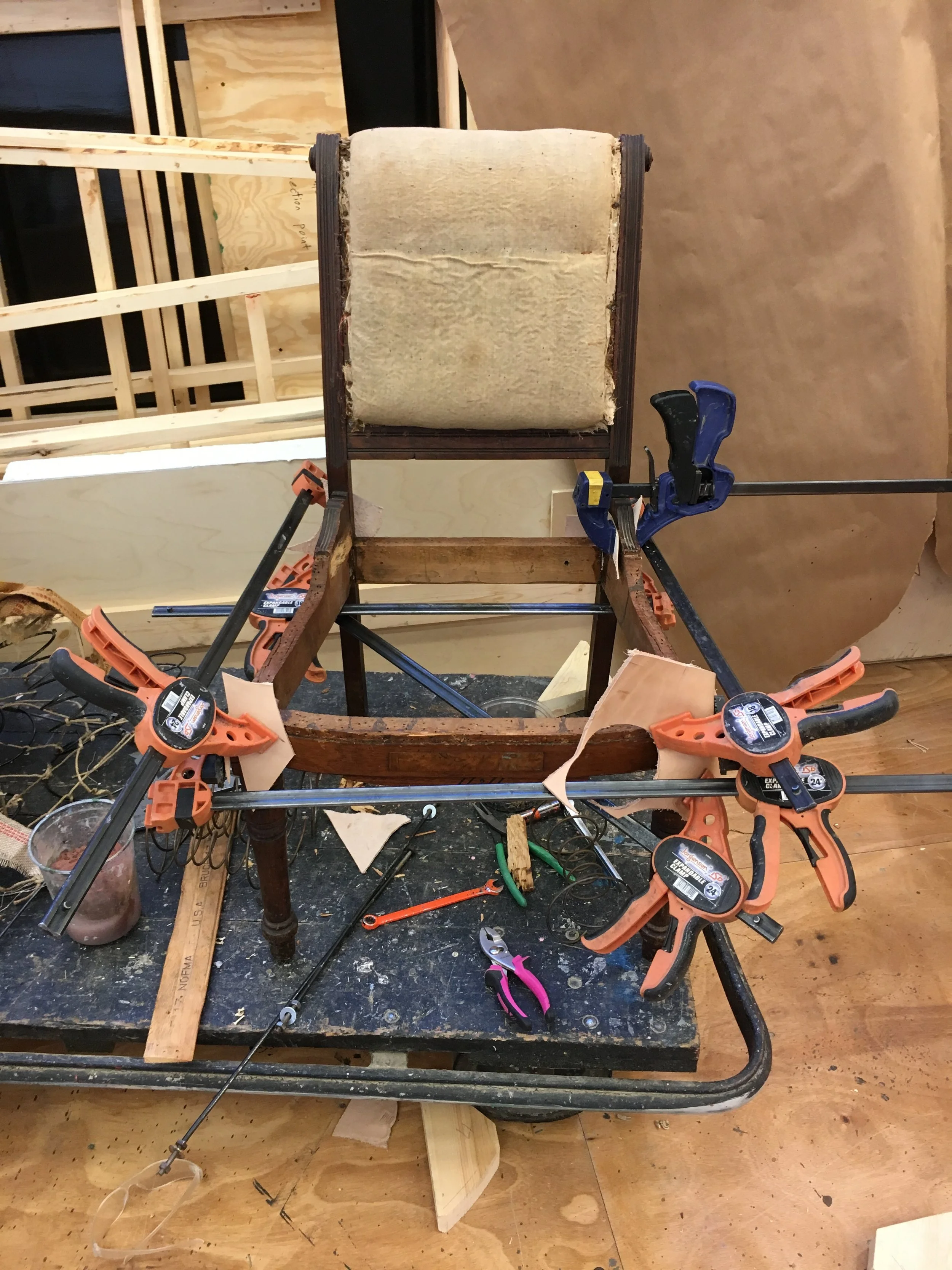 The chair was first stripped down to its frame and then glued and clamped to help get it back into square.From there the webbing was stretched, the springs were hashed and stitched, and hessian was stapled in to cover the springs. New batting was added to the top and a lovely new period appropriate fabric was stretched and stapled over it all. The frame was then touched up with stain where scratches had been and was polished. Gimp and tacks were added because of their historical style on the chair.